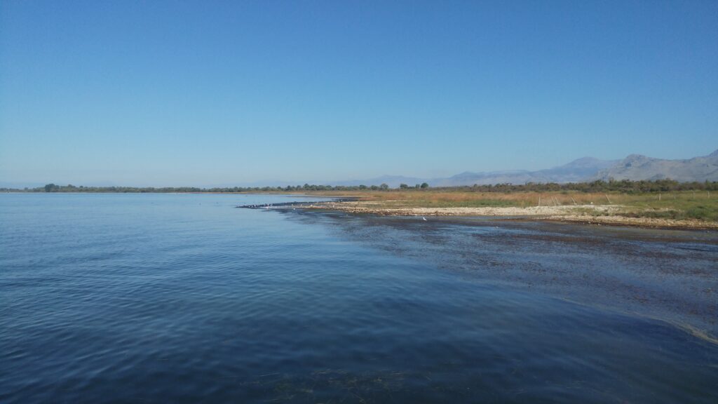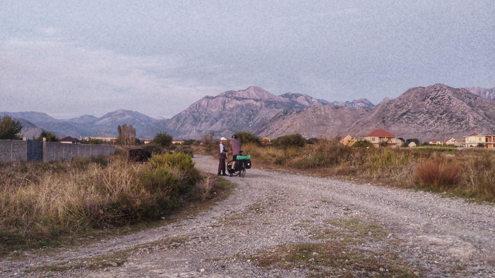 Trotz des vielen Verkehrs kamen wir gut voran. Quasi mit Erreichen von Podgorica passierte, woraus wir fast schon gewartet hatten. David bemerkte eine gebrochene Speiche an seinem Hinterrad. Wir hatten natürlich daran gedacht, Ersatzspeichen und Nippel mitzunehmen, jedoch eine Speiche getauscht, hatten wir jedoch beide noch nie. Aus den Erzählungen der beiden Frauen vom Zeltplatz am Tag vorher wussten wir, dass der einzige Fahrradladen in Montenegro gegenüber einer großen Mall, mitten in der Innenstadt, lag. Nach 20 Minuten warten, rollten wir weiter stadtauswärts, bald durch eine fast steppenartige Landschaft in Richtung der Grenze zu Albanien, den Shkodra See immer wieder in Blickweite.