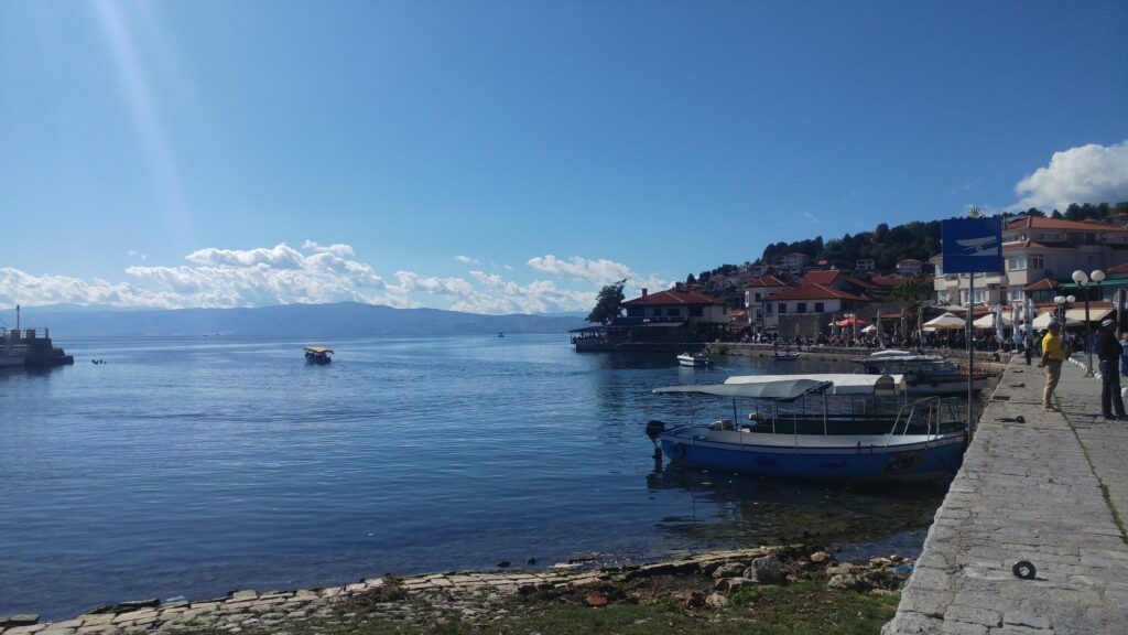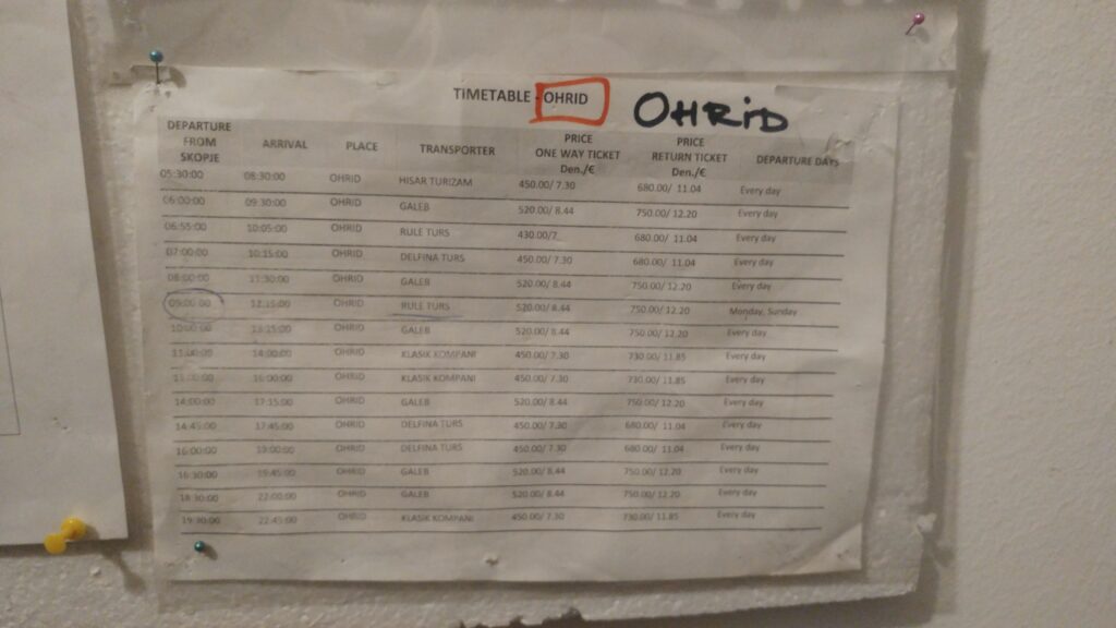 Da standen wir nun ganz schön verloren und etwas ratlos alleine am Bahnsteig. Zurück im Hostel musste erstmal Frühstück her. Nach einer kurzen Beratung bekamen wir den Tipp, es mit einem Überland-Bus zu versuchen. Das war erst mal unsere nächste Hoffnung. Am Busbahnhof verstanden wir schnell, wie es läuft: Erst mal mit dem Busfahrer sprechen, mit diesem verhandeln und dann am Schalter ein Ticket kaufen. Rückblickend war das doch sehr einfach und unkompliziert und dank eines kleinen Taschengeldes wurden wir mitsamt unserer Räder und dem Gepäcks bis Ohrid, am gleichnamigen See, mitgenommen.