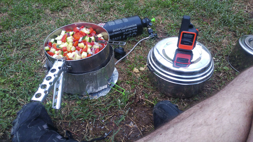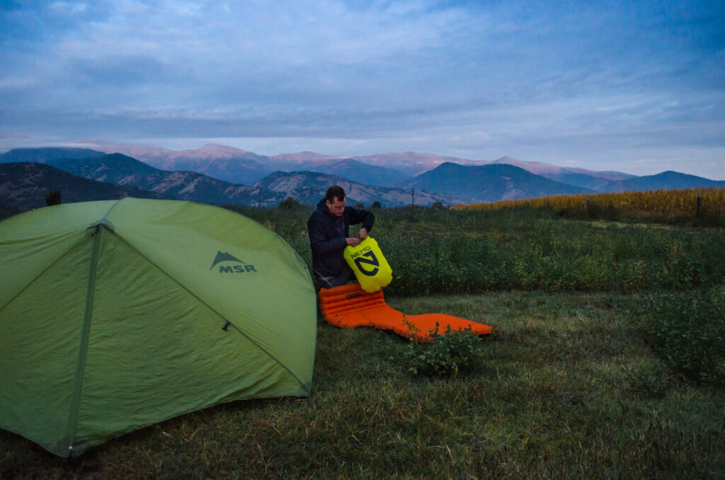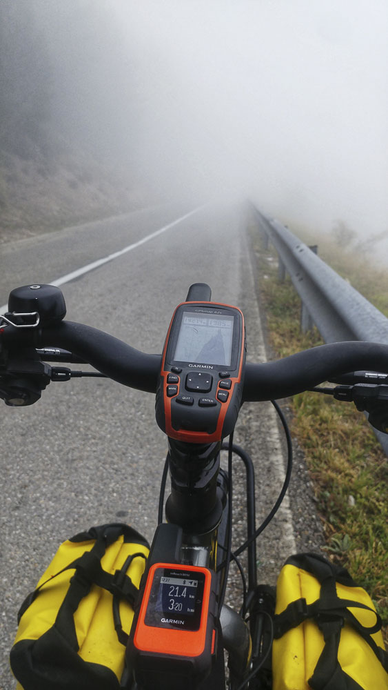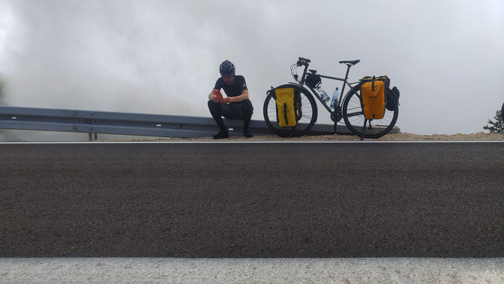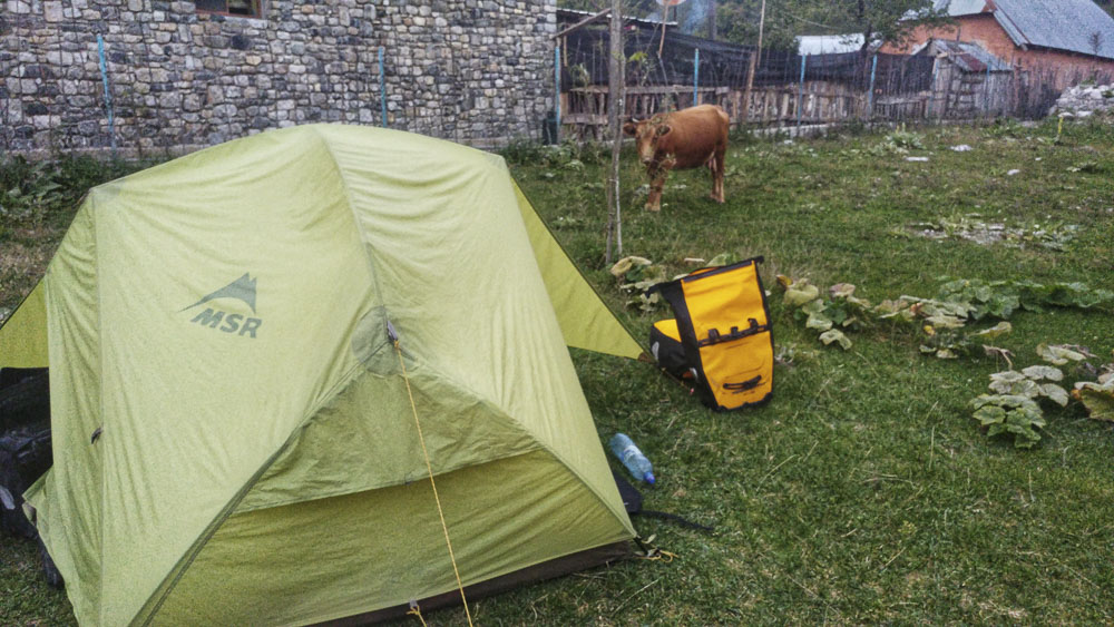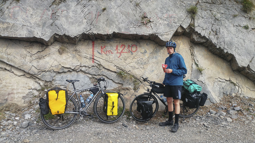 Nach einem kurzen Einkauf in Cetinje und Stop an der Tankstelle, um Benzin für den Kocher aufzufüllen, hatten wir die erste Fahrradpanne – David hatte einen platten Vorderreifen, im Halbdunkel, nur wenige Kilometer außerhalb der Stadt. Es half alles nichts, wir mussten rechts ran fahren und den Schlauch im Schein der Stirnlampe wechseln. (Wir hatten beide jeweils einen Ersatzschlauch dabei. Unser Plan war, im Falle einer Panne einfach den Schlauch zu tauschen und den Defekten dann in Ruhe an einem Pausentag zu flicken).