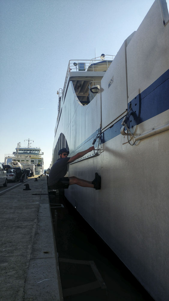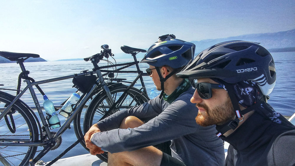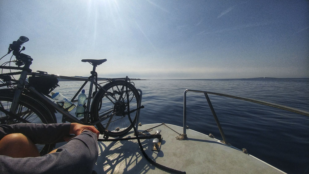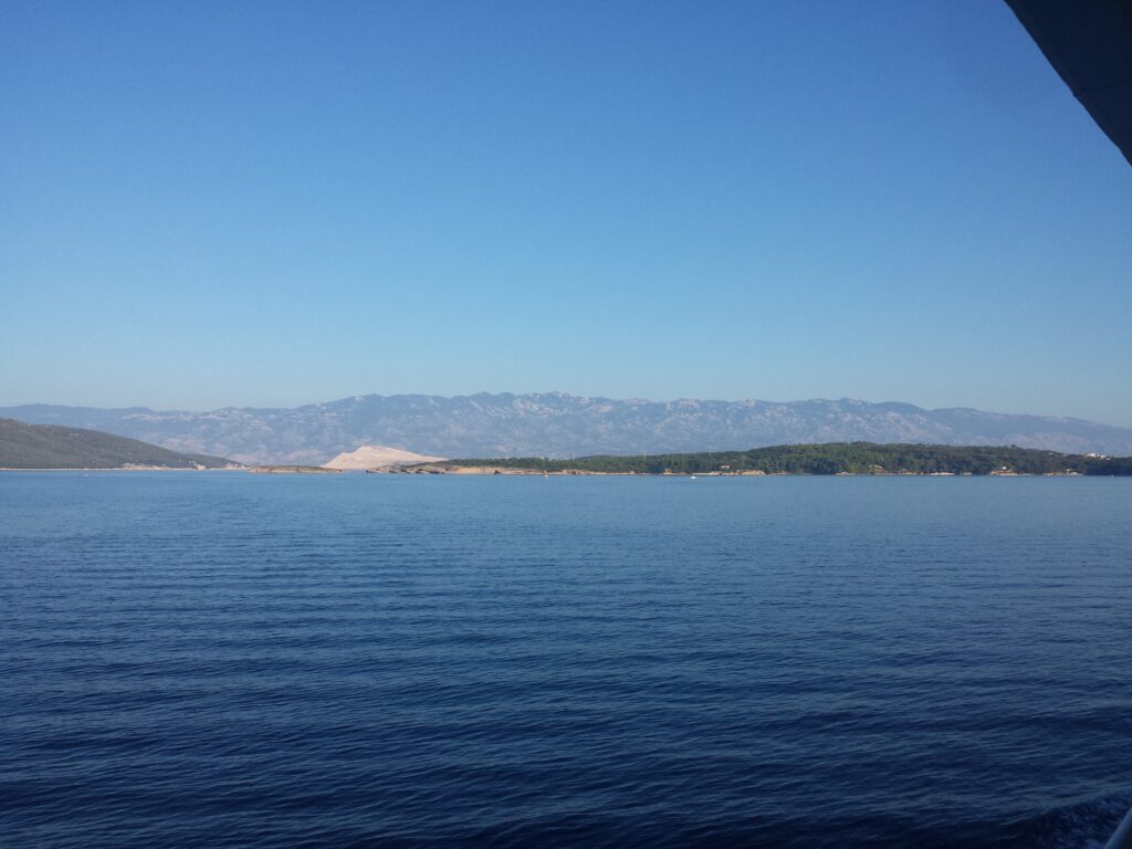 Nächster Morgen – nächste Insel: Pag. Die „Fähre“ war eher ein kleines Boot, unsere Räder wurden provisorisch an Deck festgebunden und wir durften uns vorne aufs Deck setzen. Es folgte eine schaukelige Überfahrt bei strahlend blauem Himmel. Ich hatte gehofft Delfine zu sehen, leider haben sich keine gezeigt.