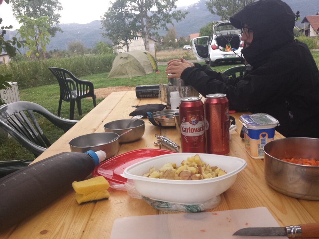 Die folgenden 14 km wurden die bis dahin anspruchsvollsten unserer Reise. Wir krochen mit durchschnittlichen 6km/h den Berg hoch, immer wieder von so heftigen Böen begleitet, dass uns nichts anderes übrig blieb, als anzuhalten. Teilweise war an Fahrradfahren nicht zu denken, ich wurde mehrfach, einfach so, vom Rad geweht oder gegen die Leitplanke gedrückt. Hinter der ersten Bergkette war es dann auch vorbei mit dem guten Wetter. Dunkelgrauer Himmel, weiterer starker Wind und Gewitter erwarteten uns. Bei gefühlt 20 Grad weniger und sichtlich abgekämpft, erreichten wir kurz vor Gracac wieder die geplante Route. Nach einem kurzen Abstecher zum örtlichen Supermarkt fanden wir einen kleinen Campingplatz außerhalb des Orts. Nach einigem hin und her waren wir uns einig, dass eine heiße Dusche nötig war.