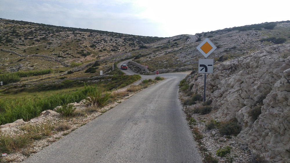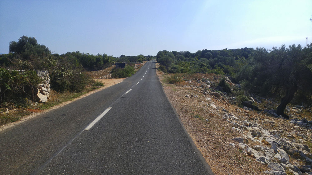 Nun gab es quasi keinen Schatten mehr, es war aber auch nicht mehr so bergig wie bisher auf den anderen Inseln. Außer einigen wenigen Einheimischen trafen wir niemanden mehr. Kaum waren wir 30 km unterwegs, ging uns pünktlich zur Mittagszeit das Wasser aus. An der Kirche in Novalja bekamen wir Wasser beim Pfarrer und konnten weiter fahren.