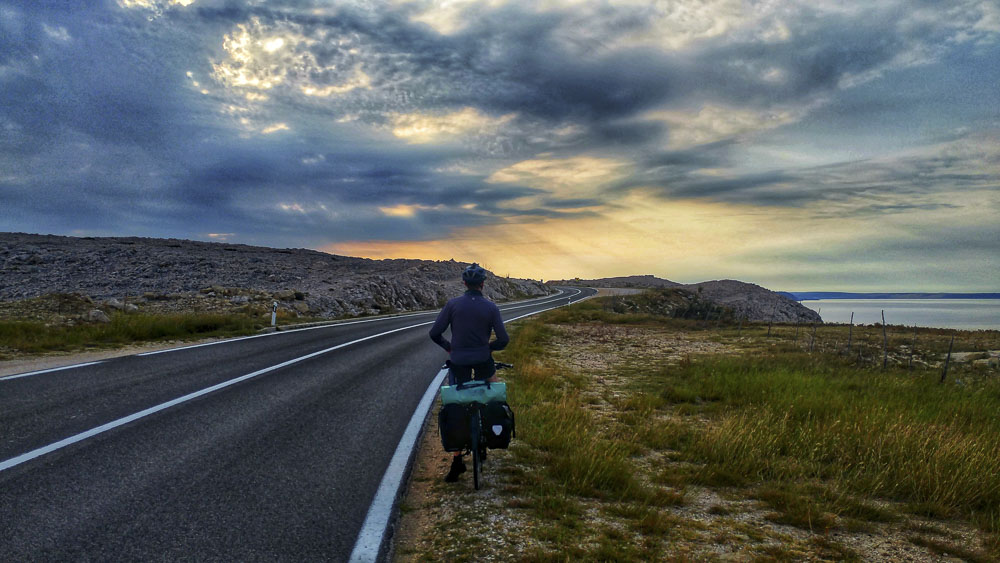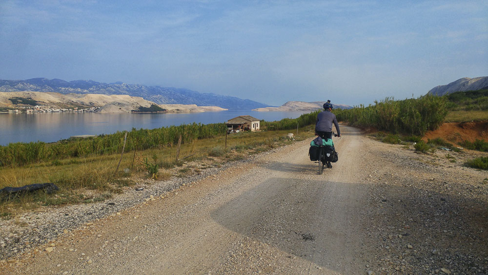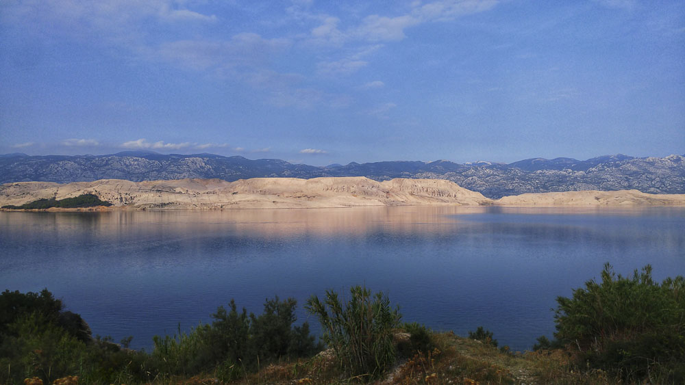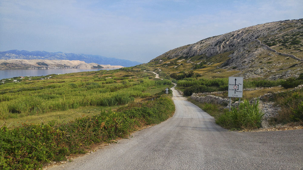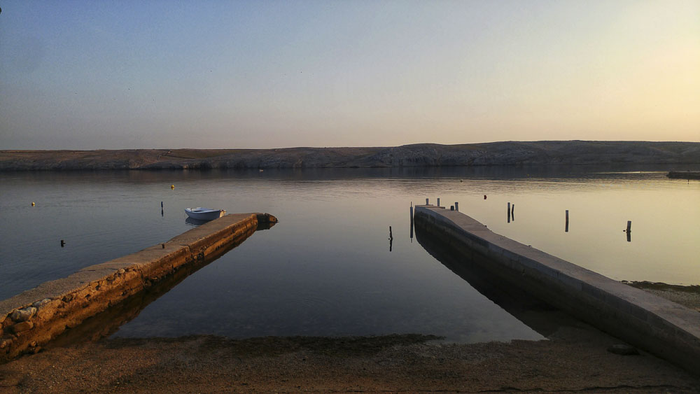 n Pag selbst führte der Weg vorbei an kleinen Fischerbooten, entlang eines riesigen Beckens zur Meersalzgewinnung. Obwohl die Straße in gutem Zustand und einigermaßen flach war, kam hartnäckiger Gegenwind auf, der uns nicht wieder los ließ. In Dinjiska bot sich eine Campingmöglichkeit bei einer netten Familie im Garten. Der eigene Steeg ins Meer war der krönende Abschluss des Tages.