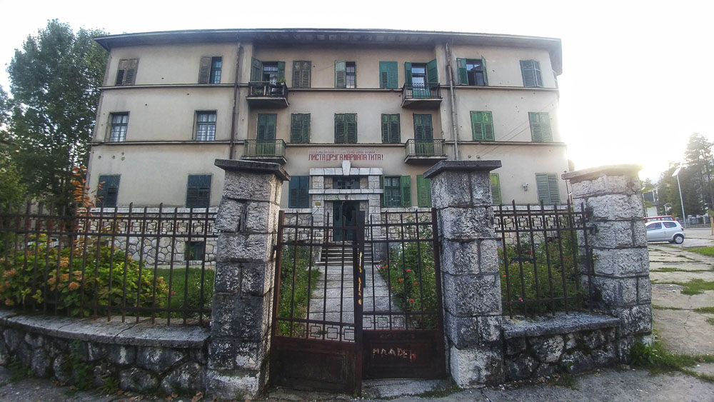 Es folgte eine recht abenteuerliche Abfahrt über eine tief ausgewaschene Schotterpiste, die stellenweise durch kleinere Bergrutsche beschädigt war. Auf halber Strecke hinunter ins Tal trafen wir auf ein Rudel Hunde, vermutlich die versammelte Mannschaft der umliegenden Höfe, die sich jedoch durch das Klappern des Topfsets in der Radtasche und unseren Lampen einigermaßen beeindrucken ließen und uns in Ruhe ließen. Der Ortseingang von Rijeka Crnojevića war auch nicht besonders einladend. Verlassene und halb verfallene Gebäude wechselten sich im Schein der Stirnlampen mit riesigen sowjetischen Kriegsdenkmälern ab, gefolgt von einer großen Industrieruine. Zu unserer Erleichterung war der Campingplatz, der stark an einen aufgegebenen Fußballplatz erinnerte, beleuchtet und belebt. Hätte es diesen Campingplatz nicht gegeben, so wie in unserer Karte angeben, wir wären auch im Stockfinsteren und nach den ganzen Strapazen des Tages wieder zur anderen Seite aus dem Tal hinausgefahren. Stattdessen bauten wir erleichtert und auch ganz schön erschöpft unser Zelt an der Crnojević, dem nördlichen Zufluss des Skutarisee (auch Shkodrasee oder Skadarsee, dem größer See der Balkanhalbinsel) auf