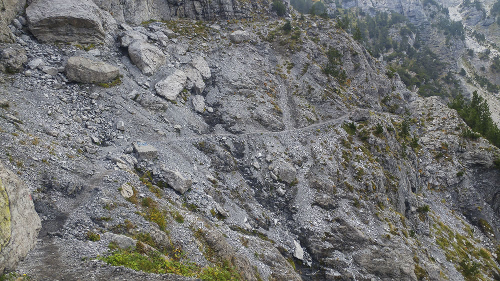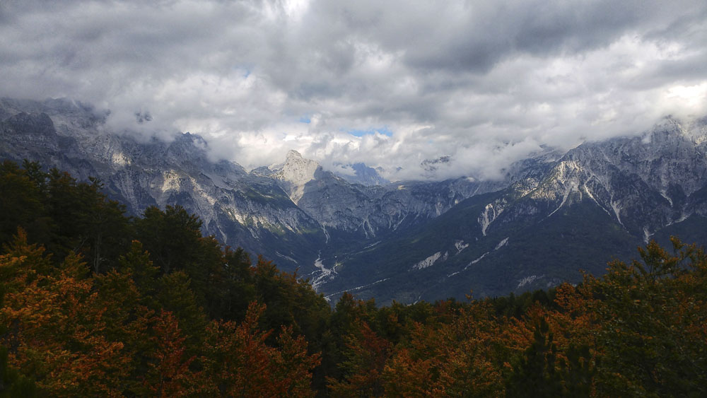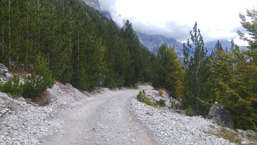 Je näher wir Theth kamen, umso herbstlicher wurde es. Und umso schlechter wurde die Straße. Mittendrin war der Hang abgerutscht und mit schwerem Gerät wieder frei geräumt worden. Leider hatte auch der Untergrund merklich gelitten und war wie von Wildschweinen umgegraben.
