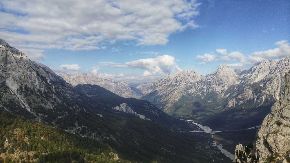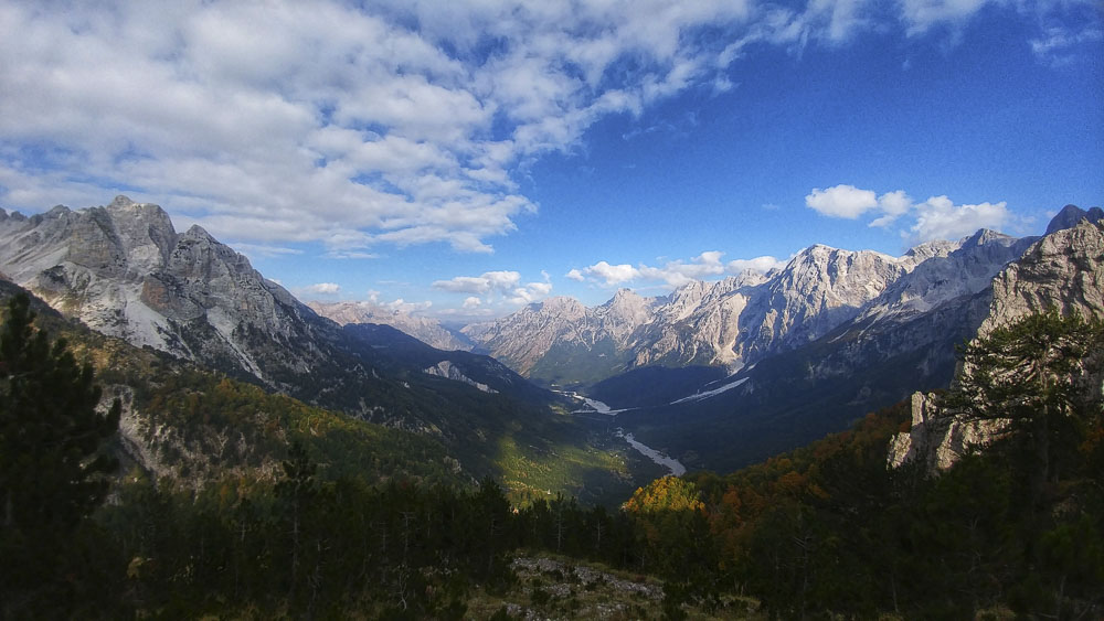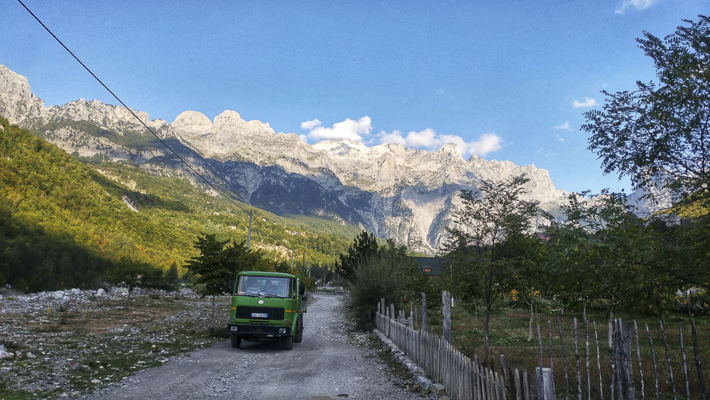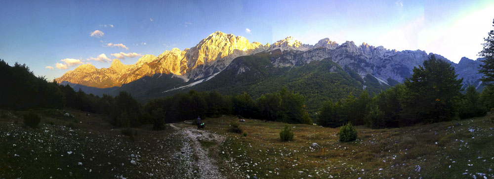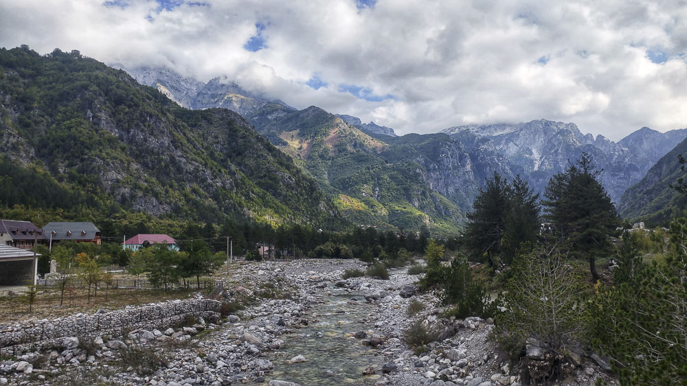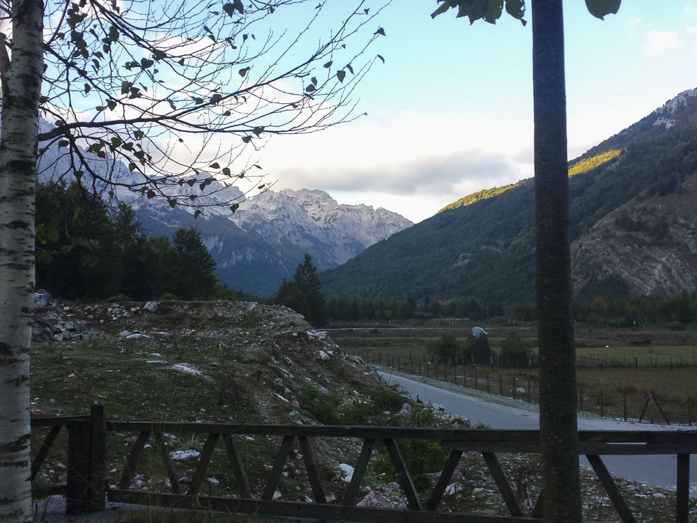 Mit dieser Weisheit in den Ohren schoben wir unsere Räder bergab wie wir sie hinauf geschoben hatten, beide Hände immer an den Bremsen und voller Konzentration. Erst als wir die ersten versprengten Häuser in den Ausläufern des Valbonë Tal erreichten, war zeitweise daran zu denken, wieder aufs Rad zu steigen. Nach einem quälend langen und anstrengenden Stück Piste durch ein trockenes Flussbett erreichten wir, schon nach Einbruch der Dämmerung, den Beginn der asphaltierten Straße nach Valbonë. Da die Urlaubssaison hier längt vorbei war und der Herbst sich ankündigte, hatte kein Campingplatz mehr geöffnet. Letztendlich durften wir im Vorgarten eines Restaurants zelten und sogar das W-Lan nutzen.