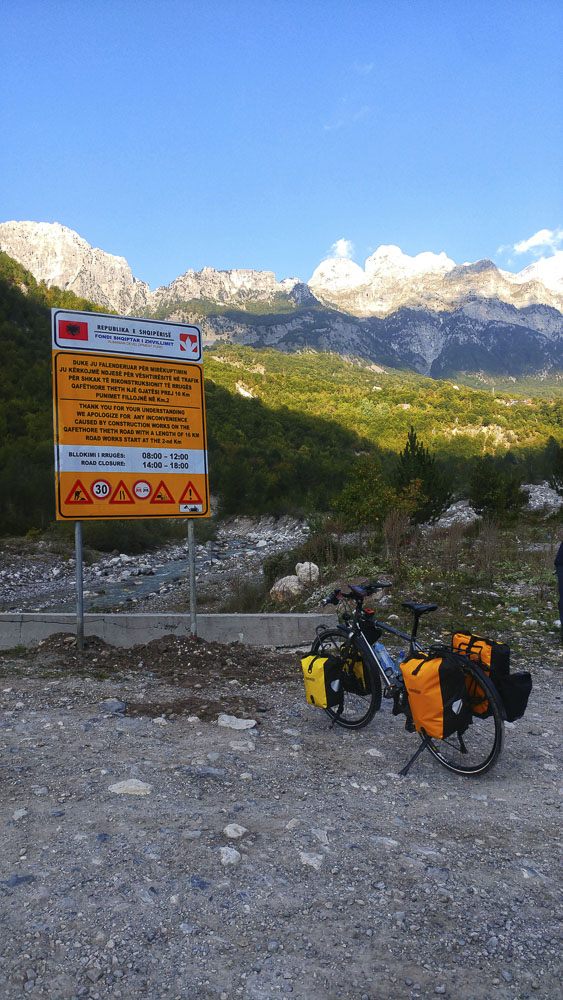 Ich hatte im Zelt genau die Karte studiert und mit dem GPS Track abgeglichen: der Anstieg bis auf den Bergsattel war ungefähr 8km lang. Mit 1.100 Höhenmetern. Also starteten wir überaus motiviert und früh am Tag, um in alpinem Gelände möglichst nicht in die Dunkelheit zu kommen. Als wir an der Brücke zur Straße zurück nach Bogë vorbei kamen, fiel uns ein neues Straßenschild auf. (Nicht das es hier sonst Straßenschilder geben würde) Die Straße über die wir her kamen, wurde gesperrt, um sie zu planieren und asphaltieren. Vermutlich waren wir also die letzten Radfahrer, die in den Genuss dieser herausfordernden Gravel-Piste kamen.