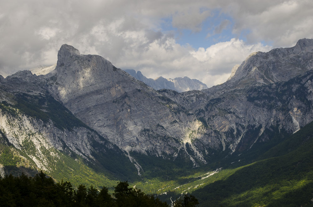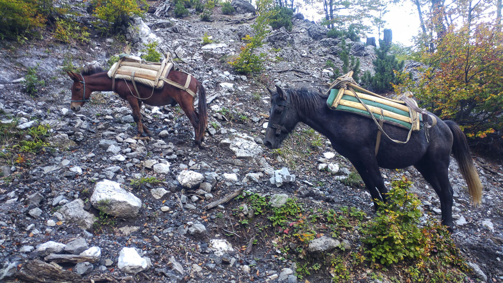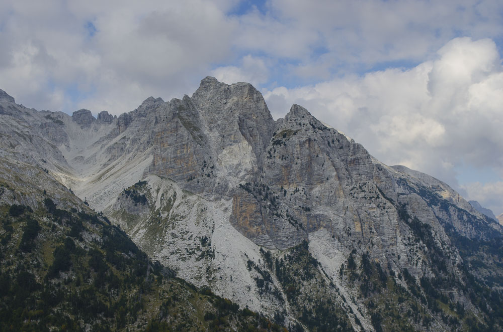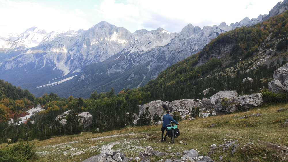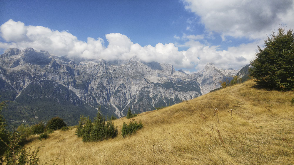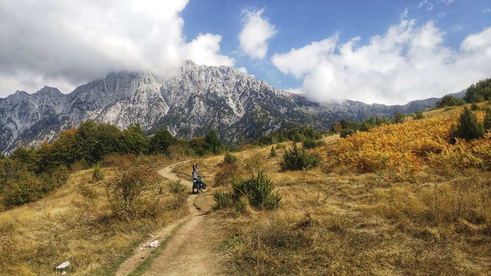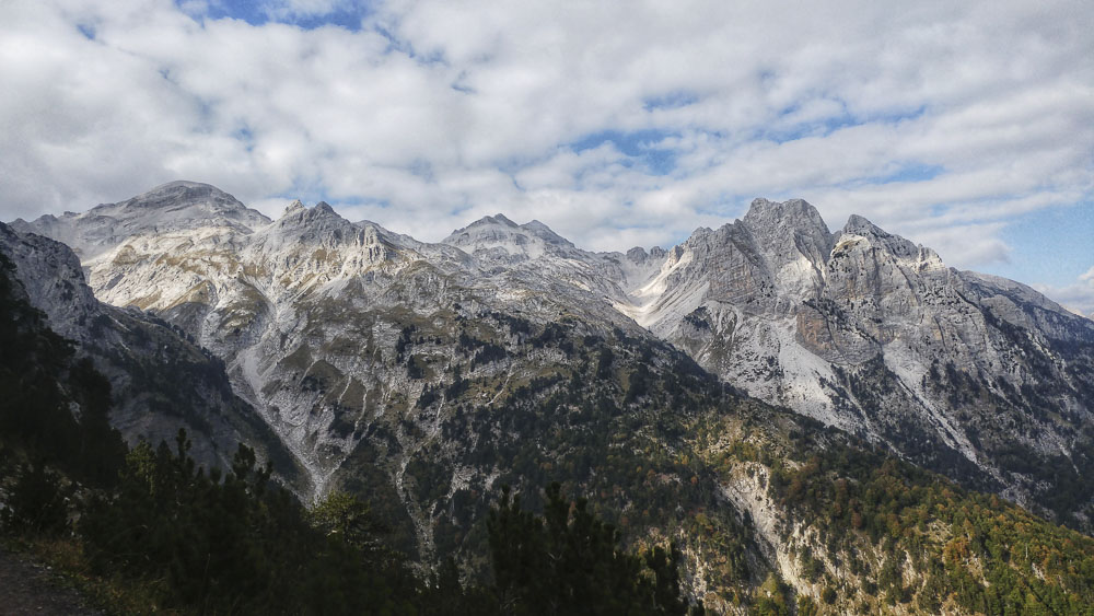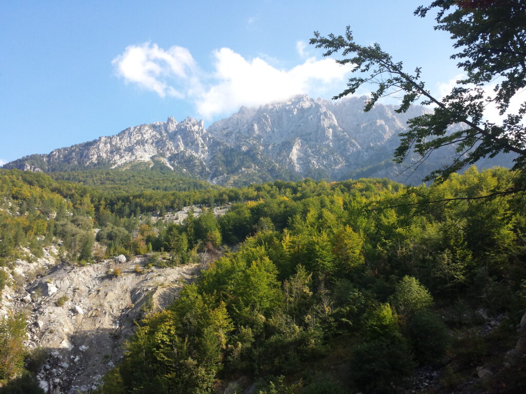 Die ersten Kilometer waren vermutlich die frustrierendsten der Reise. Wie zu erwarten, war an Fahrradfahren nicht zu denken. Der Weg war einfach zu steil und zu schlecht und so ging es einfach langsam schiebend voran. Da wir vor allem durch dichten Wald schoben, war auch die Landschaft eher eintönig. Als wir auf ein kleines Plateau kamen und der Blick frei auf die Wände des Maja E Radohimës fiel, waren wir erst einmal sprachlos. Nach einer kurzer Pause und einem ersten Mittagessen vor dieser Szenerie ging es mit neuer Motivation und Kraft weiter bergauf. Hin und wieder kam uns ein Eselführer mit Gepäck entgegen, ansonsten mühten wir uns recht einsam ab.