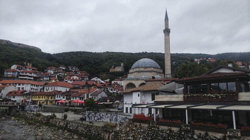 Unsere Tourenplanung sah vor, weiter durch die albanischen Berge über Krumë und Kukës in den Kosovo zu fahren. Nach den Strapazen der letzten Tage waren wir jedoch wenig motiviert noch mehr Berge zu sehen und entschlossen spontan Richtung Nord-Osten zu fahren, um über Gjakovë nach Prizren in den Kosovo zu kommen. Was wir natürlich nicht so direkt bemerkten: natürlich befindet sich der Grenzübergang zum Kosovo auf einer Bergkette und natürlich hatten wir uns mal wieder die heißeste Zeit des Tages ausgesucht, dort hochzufahren. Nach einem sehr netten Gespräch an der Grenze (Der Beamte dort sprach sehr gut deutsch und war großer FC Bayern München Fan) fuhren wir auf bestem Asphalt in Richtung Gjakovë. Wir hatten einen richtig guten Tag und dank des windstillen Wetters und der ganz leicht abschüssigen Straße, fuhren wir mit deutlich über 30km/h nach Prizren, der zweitgrößten Stadt des Kosovos. Etwas überrascht von unserer Leistung, checkten wir mangels Alternativen bei Edis im Hostel M99, mitten in der Innenstadt, ein. Den verbliebenen Abend nutzen wir, um die Innenstadt zu erkunden, Essen zu gehen und mal wieder richtig ausgiebig zu duschen. Vielleicht auch nicht ganz in dieser Reihenfolge.
