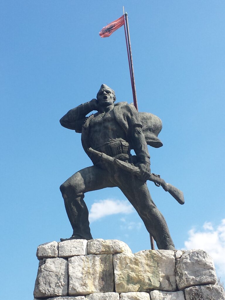 Mit dem nächsten Morgen wurde aus einer Vermutung dann Gewissheit: Hier war es längst richtig Herbst! Die bunten Blätter an den Bäumen und die dünne Eisschicht auf dem Zelt sorgten dafür, dass wir beim Kochen, Packen und Co nicht so richtig in Fahrt kamen. Erst als die Sonne in das schmale Tal schien, machten wir uns auf den Weg, weiter das Tal hinunter nach Bajram Curri, um Lebensmittel und Kocherbenzin zu kaufen. Nachdem wir bergeweise frisches Obst und Gemüse, Nudeln und Backwaren gekauft hatten, (das kommt davon wenn man hungrig Einkaufen geht) machten wir eine längere Mittagspause kurz vor der Stadt am Denkmal des namensgebenden Freiheitskämpfers Bajram Curri.